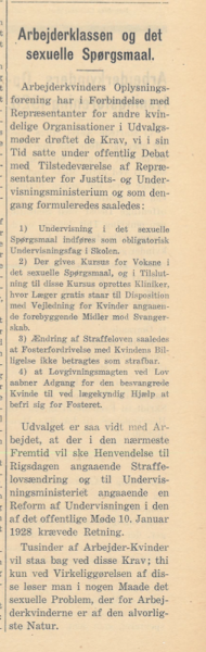 Arbejderkvindernes Oplysningsforbund rettede i 1929 henvendelse til Rigsdagen med fire krav til kvinders rettigheder til krop og seksualoplysning. Klik på kilden fra Arbejderkvindernes Oplysningsblad nedenfor og læs den højt med din(e) makker(e). Diskuter følgende spørgsmål: