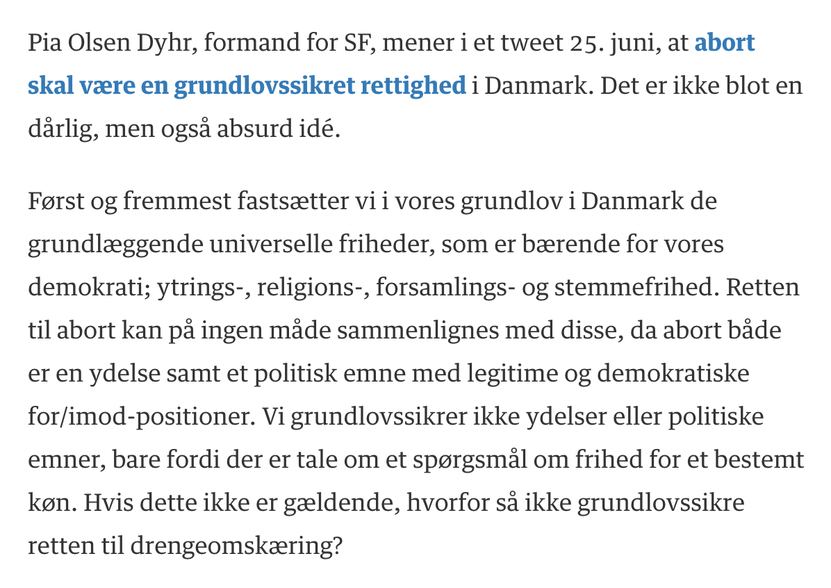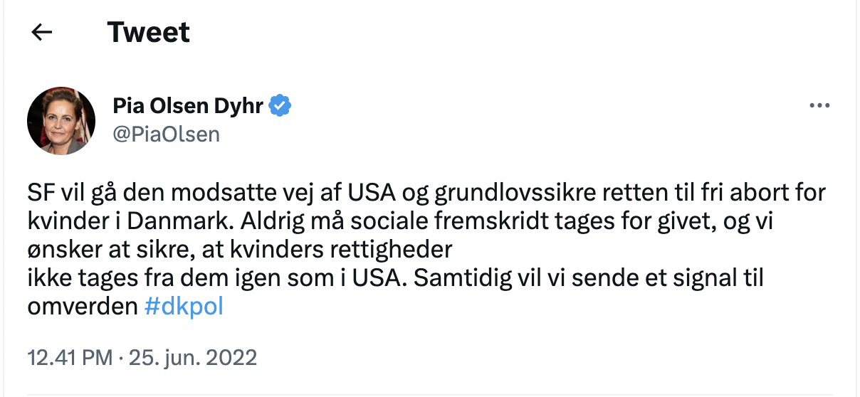 I 2022 argumenterede Pia Olsen Dyhr (formand for SF) på Twitter for, at abortrettigheden skulle indskrives i grundloven. Malthe Bregenhøj Nielsen (social- og sundhedsordfører, Konservativ Ungdom) argumenterede imod Pia Olsen Dyhr i Berlingske Tidende.