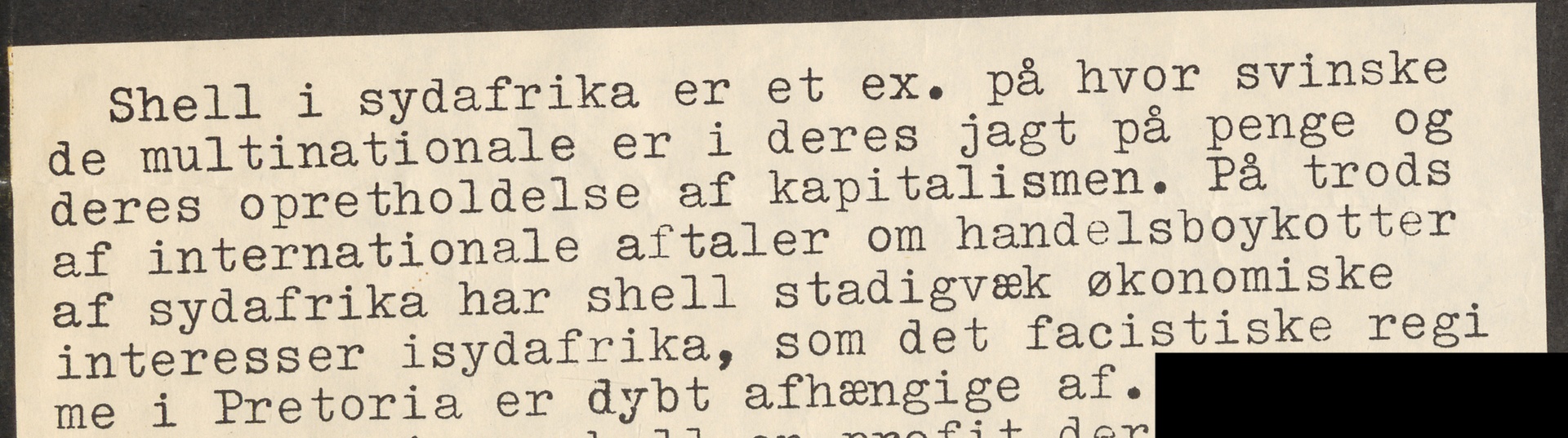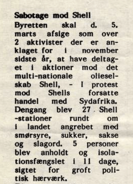 Plakaten omhandler en sabotage-aktion mod Shell-tankstioner og er lavet er gruppen Solidaritet Steve Biko. Dateringen på plakaten er 18/11, men aktionen foregik faktisk mandag d. 17. november 1986. 👇